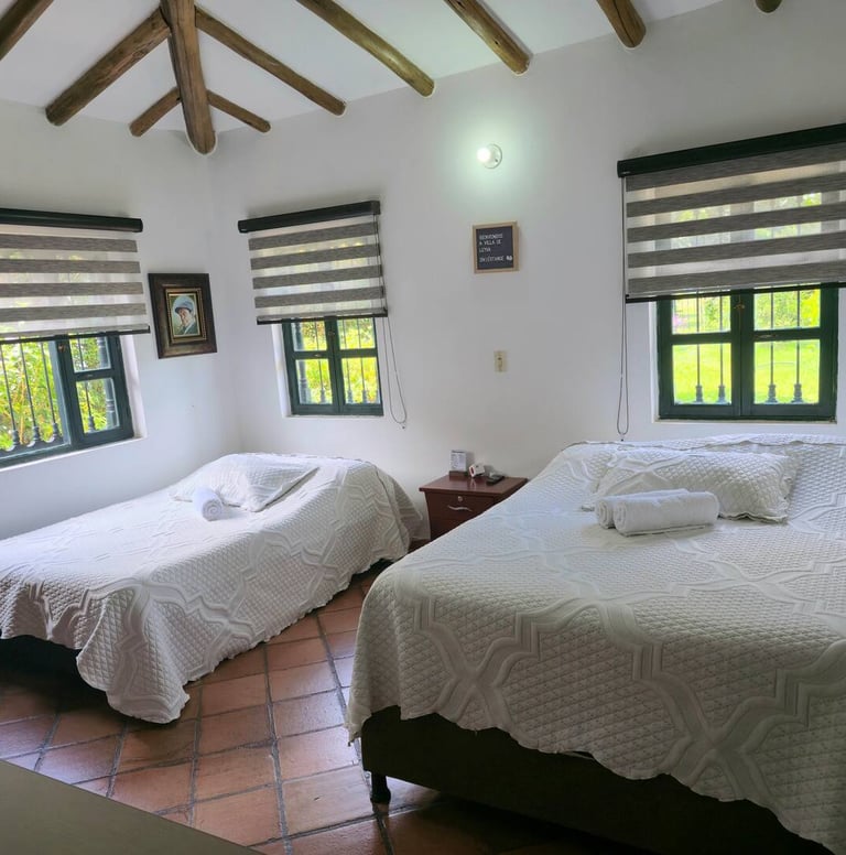 Habitación muy grande con dos camas, una doble y una semi-doble con baño privado, jabón de manos y para el cuerpo, toallas, papel higiénico, mesa de trabajo, nochero, armario con muy buen espacio.